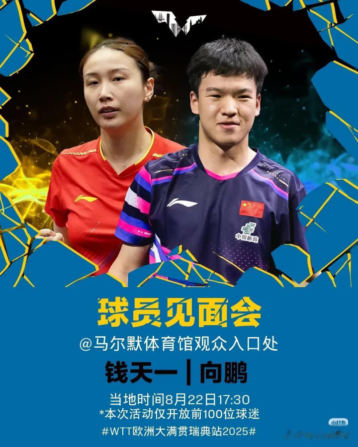 距离这次瑞典大满贯赛结束还有两天的时间,看到今天主办方安排了球员见面会,见面会的时间是当地时间17:30,这次出席见面会的球员是向鹏和钱天一,这次活动限100位球迷入场。下次比赛两个人要继续加油哦!